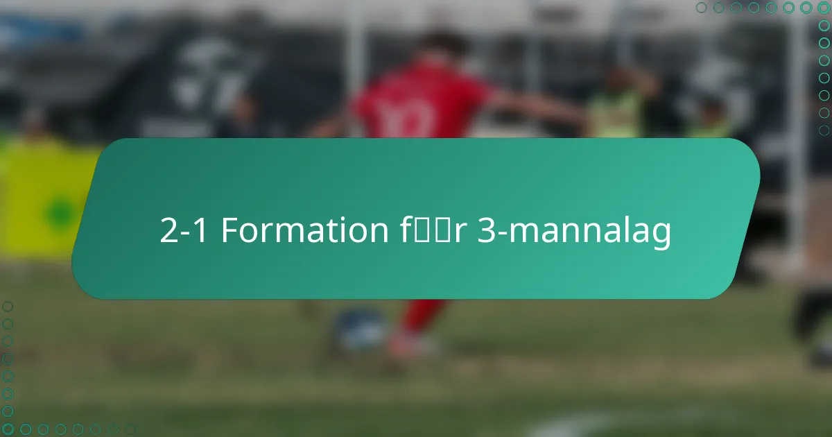 2-1-formationen i 3-mot-3-fotboll består av två försvarare och en anfallare, vilket ger en solid defensiv grund samtidigt som det skapas möjligheter för anfall. Denna strategiska uppställning förbättrar inte bara det defensiva skyddet utan uppmuntrar också dynamiska offensiva spel, vilket gör den till ett populärt val för lag som strävar efter att balansera båda aspekterna av spelet. Att förstå spelarnas positionering och kommunikation är avgörande för att effektivt implementera denna formation.