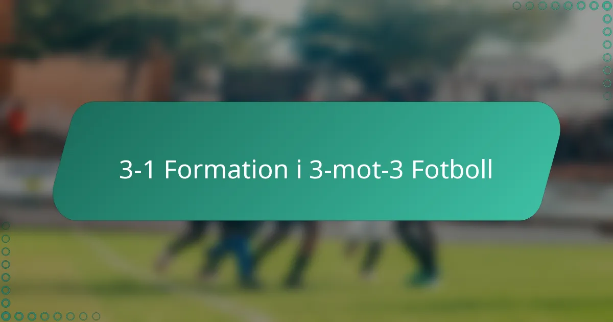 3-1-formationen i tre-mot-tre-fotboll är en taktisk uppställning där tre spelare fokuserar på försvars- och mittfältsroller, medan en spelare agerar som anfallare. Denna arrangemang syftar till att balansera offensiva och defensiva ansvar, vilket möjliggör smidiga övergångar under spelet.